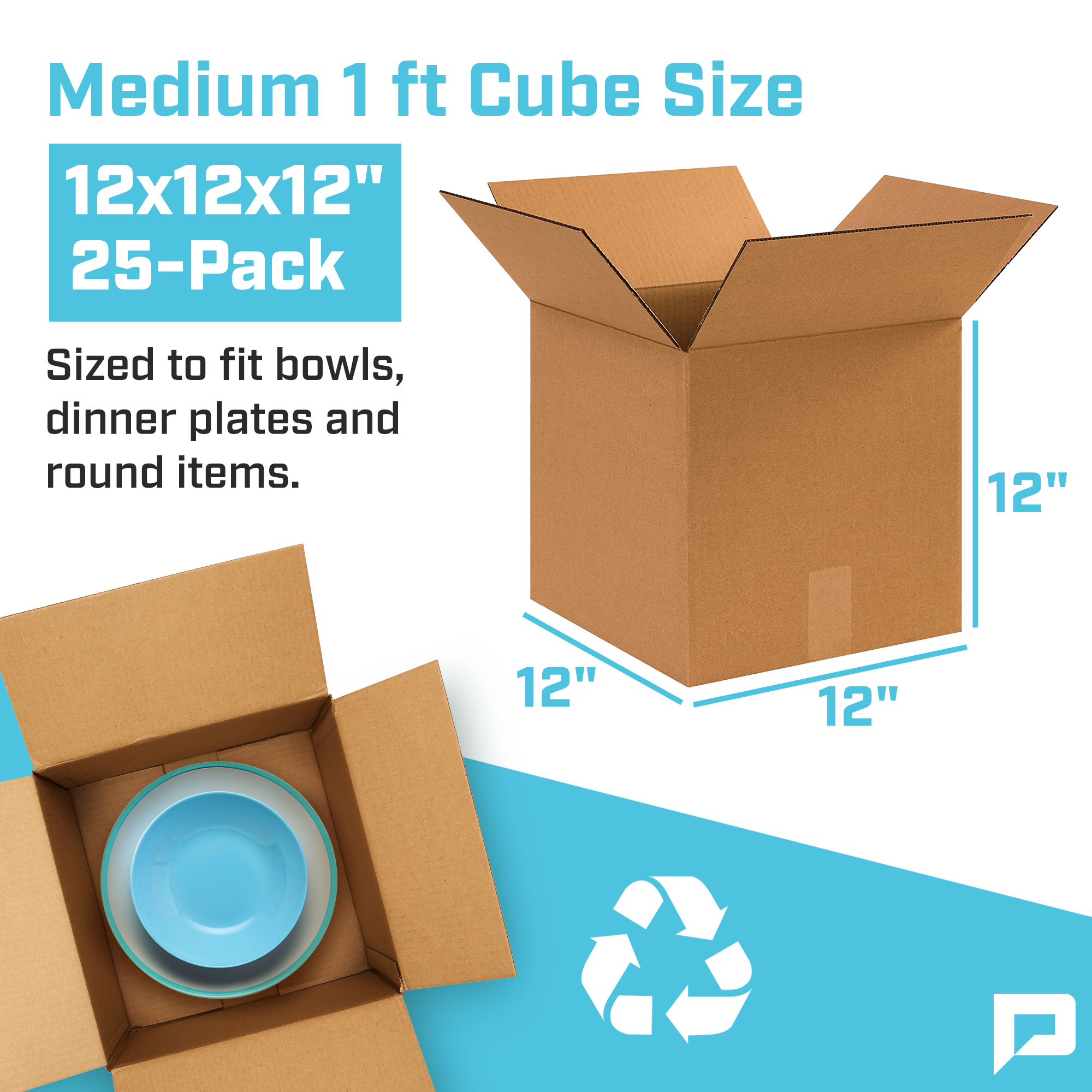 Corrugated Boxes: 12"L x 12"W x 12"H. Corrugated Box. 25-Pack, Shipped Flat. Reusable & Recyclable.