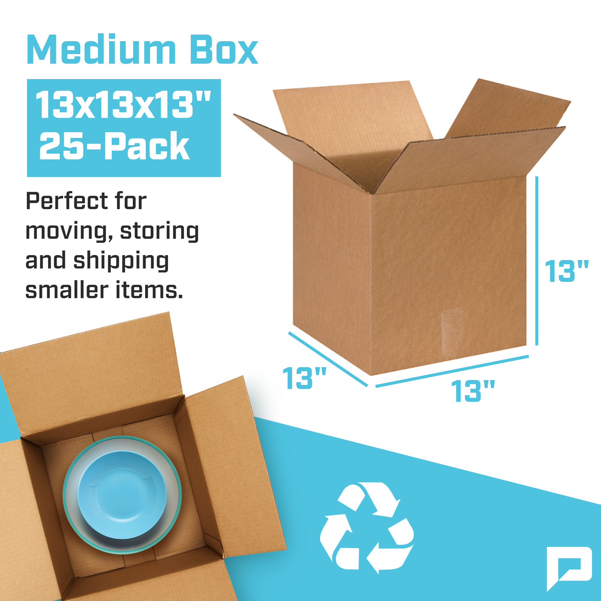 13"L x 13"W x 13"H Corrugated Box, 25-Pack. Shipped Flat. Reusable & Recyclable.